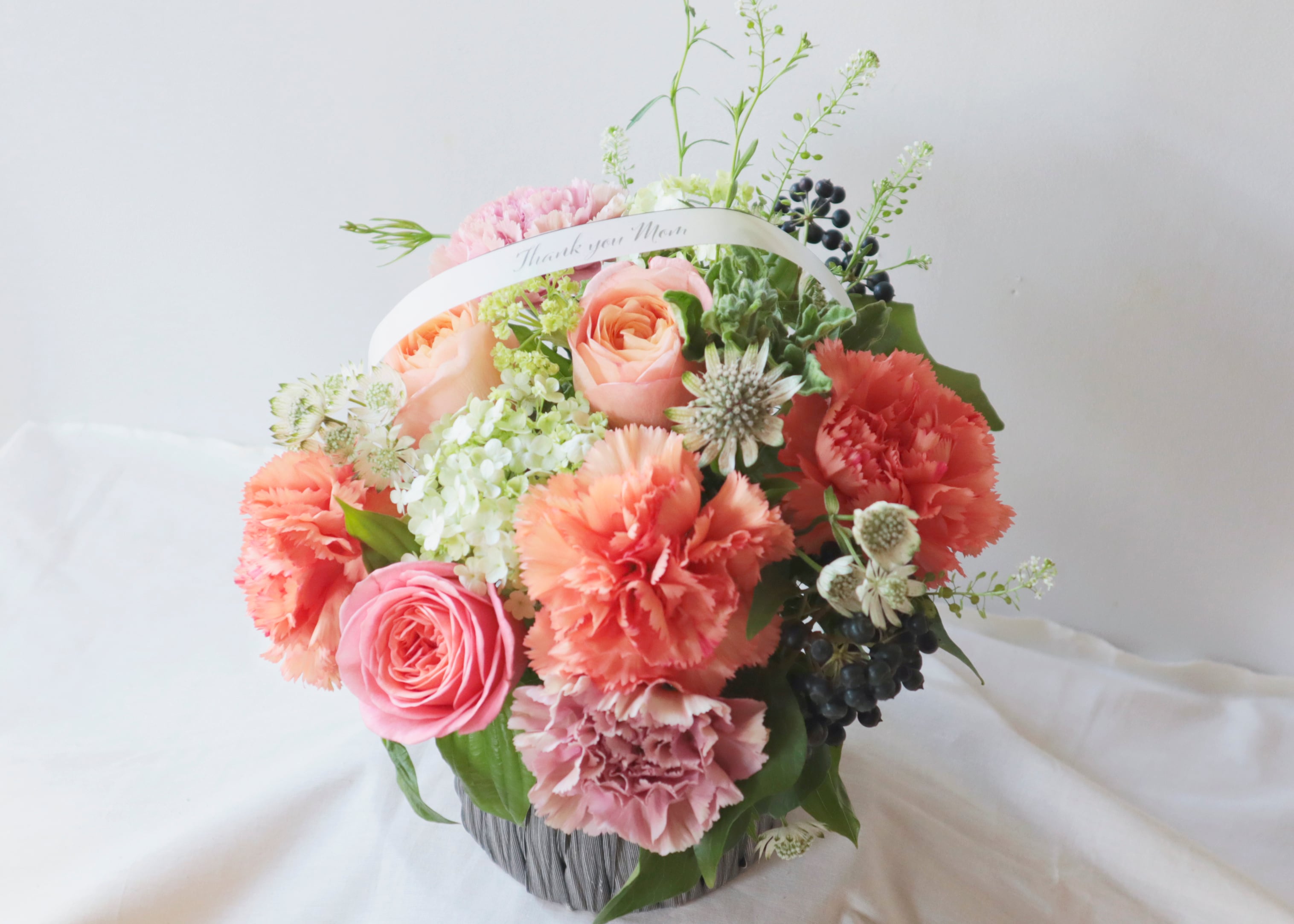 繊細な色彩のカーネーションとバラを主役に、季節の草花や瑞々しいグリーンを添え、ナチュラルで優しい雰囲気と、気品ある華やかさを兼ね備えたお花は、飾るだけでお母さんの毎日に心安らぐ彩りを運びます。